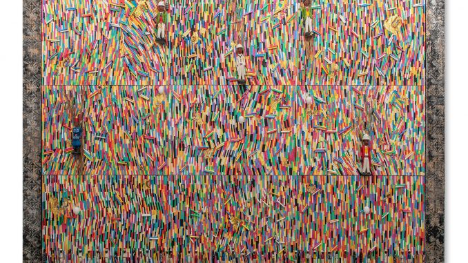 Tranquility, 2017 an installation created for the occasion of Farhad Moshiri’s (Iran, b.1963) first retrospective in the US, at The Andy Warhol Museum. Considered an international leader in the neo-pop movement as well as one of the most prominent figures of Middle Eastern contemporary art, Moshiri became well known for his ironic interpretations of hybrids between traditional Iranian forms and those of the globalized consumerist and popular culture. (estimate £120,000-180,000). Pascale Marthine Tayou’s (Cameroon, b. 1967) Fresque de Craies K, 2015 is inspired by Cameroonian tradition, but also alludes to the processes of art-making and educational tools through the choice of materials typically used for writing or drawing. From the outset of his career, Tayou added an “e” to his first and middle name to give them a feminine ending, thus distancing himself from the importance of artistic authorship and male/female ascriptions. This holds for any reduction to a specific geographical or cultural origin as well. (estimate: £150,000-200,000). Gabriel de la Mora’s (Mexico, b. 1968) works bears evidence of human interaction—the points of contact, the passage of time, the wear and tear of life. Approaching his work as an archivist, de la Mora and his studio extend their hands to the tasks of sourcing, analyzing, counting, documenting, and refining a whole host of objects, from discarded shoe soles to the sides of matchboxes. In the diptych 355,050 (176,500 + 178,550), 2014 de la Mora explores the household match. Referencing the passage of time, the artist includes in the description of his medium not only how many used sides of the matchboxes each artwork contains, but also the number of matches struck on them (estimate: £100,000-150,000).